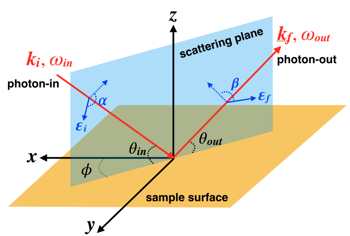 Here, we explain in more detail how geometry works in EDRIXS. From a physics point of view, the only requirement is that the coordinate system describing the crystal field and hopping is the same as the one describing the X-ray absorption and emission operators. For this discussion, it is useful to illustrate the standard RIXS geometry.